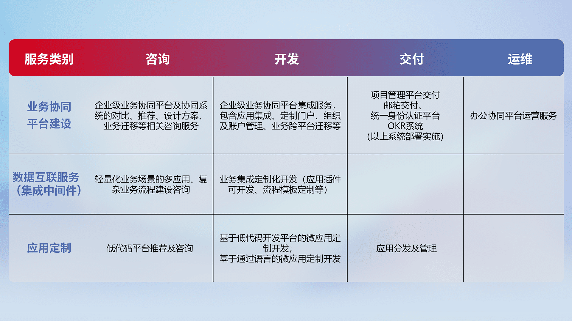 针对钉钉、、、、企微、、、IDaas等平台级产品提供产品的规划、、方案、、、、交付、、定制化开发等服务,,,实现如统一协同办公、、智能客户服务、、、、混合会议管理、、智能数据查询、、等业务场景,,,,实现数字化转型。。