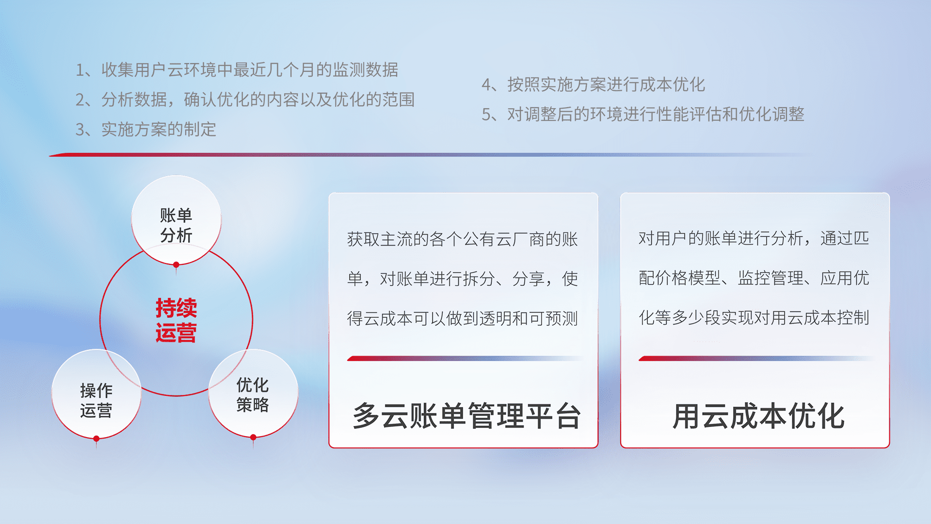 通过多云纳管,,以统一的资源数据模型把客户的云资源进行抽象和封装,,,,进而实现对多云资源的统一操作,,,保障云资源管理的可靠性、、、、稳定性与可用性。。量身定制化运维内容,,配置、、开发运维、、补丁管理、、、、备份、、、、监控、、、、认证和访问管理、、审计和日常巡检等,,,保障在用云过程中的可靠度,,,,稳定度以及高可用率。。。