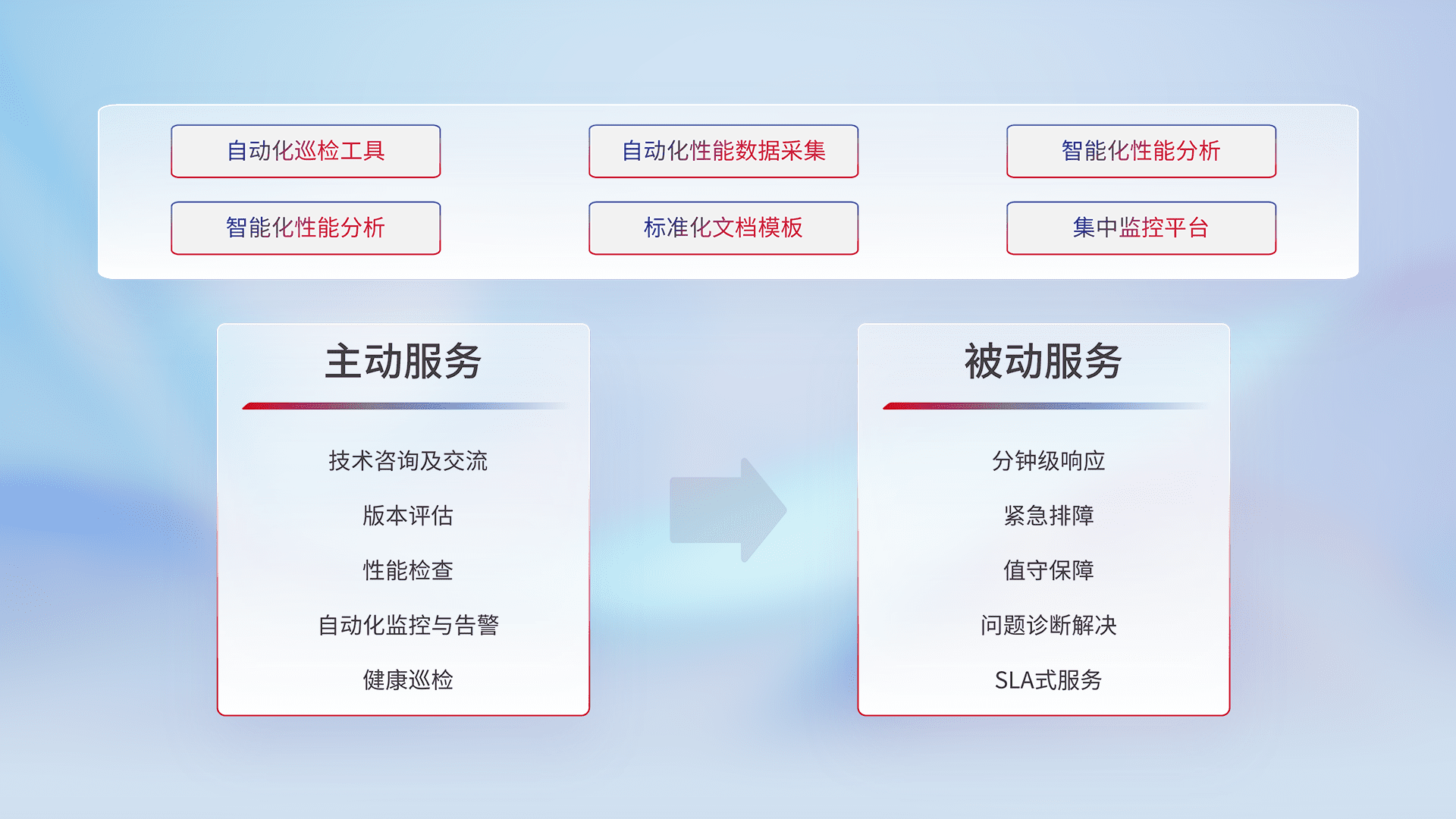 智能化工具和标准化文档,,保障服务质量,,,,提供主动服务(包含技术咨询、、、、版本评估、、、性能检查、、自动化监控与告警、、、健康巡检)和被动服务包含(分钟级响应、、、、紧急排障、、值守保障、、、问题诊断解决、、、SLA服务)。。。。